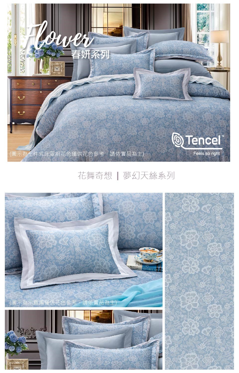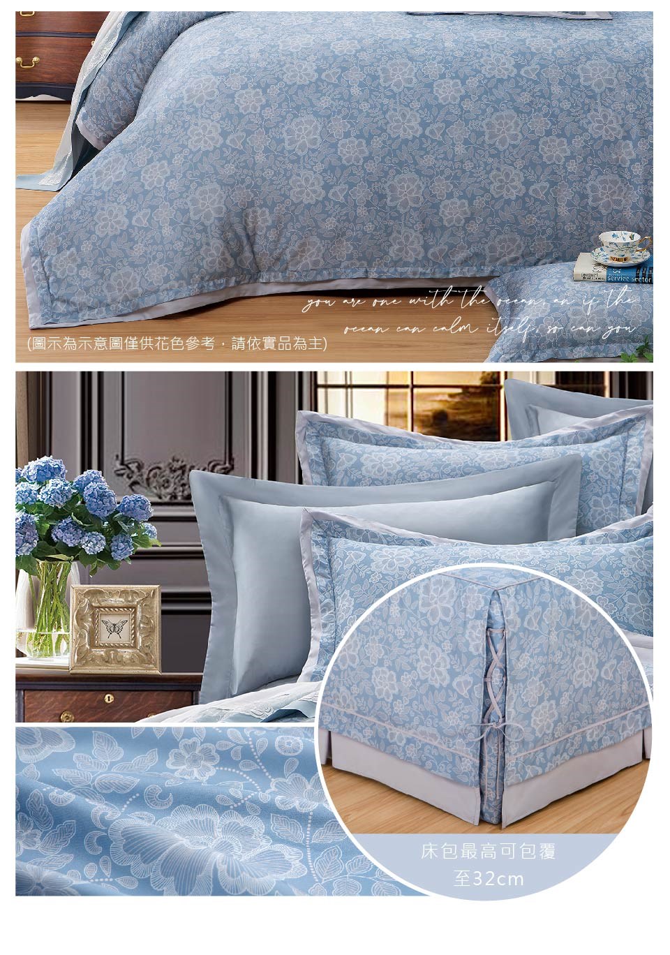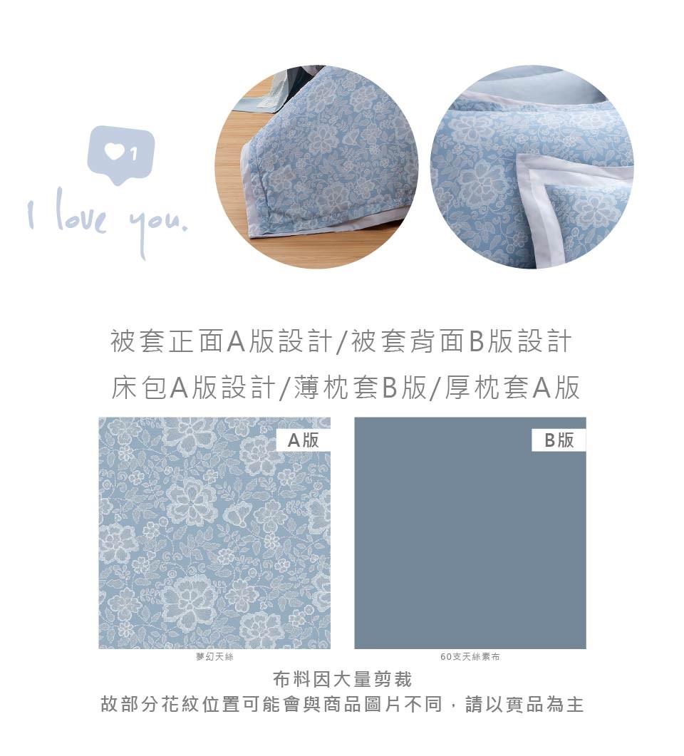 床罩組:鋪棉兩用被*1/鋪棉下裙罩*1/鋪棉厚枕套*2/薄枕套*2/抱枕*1