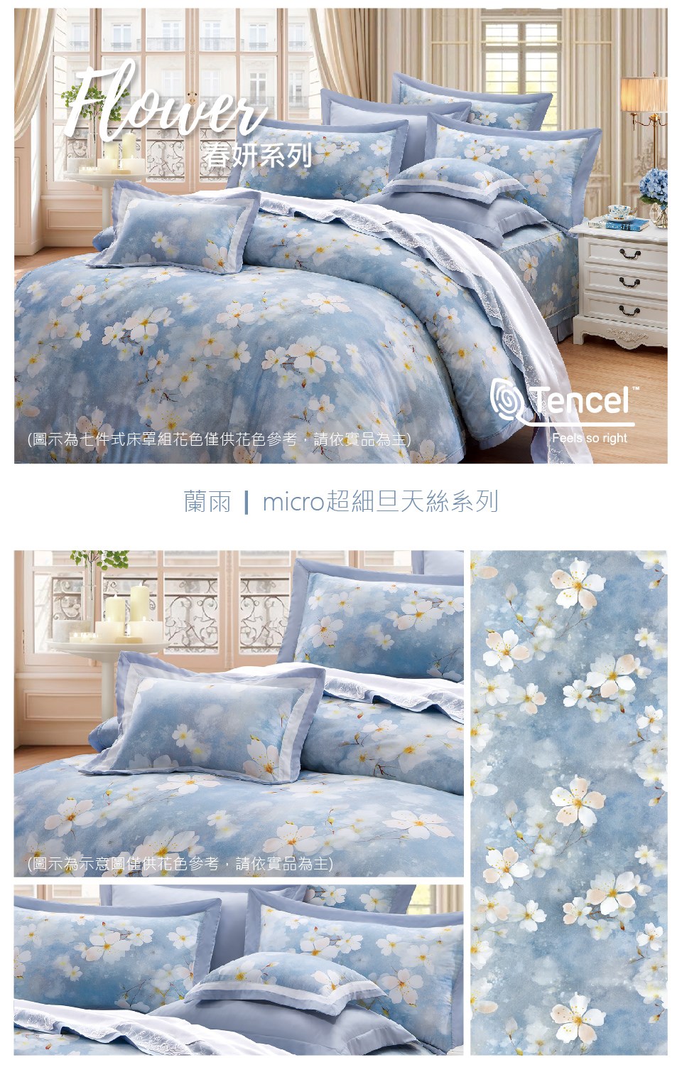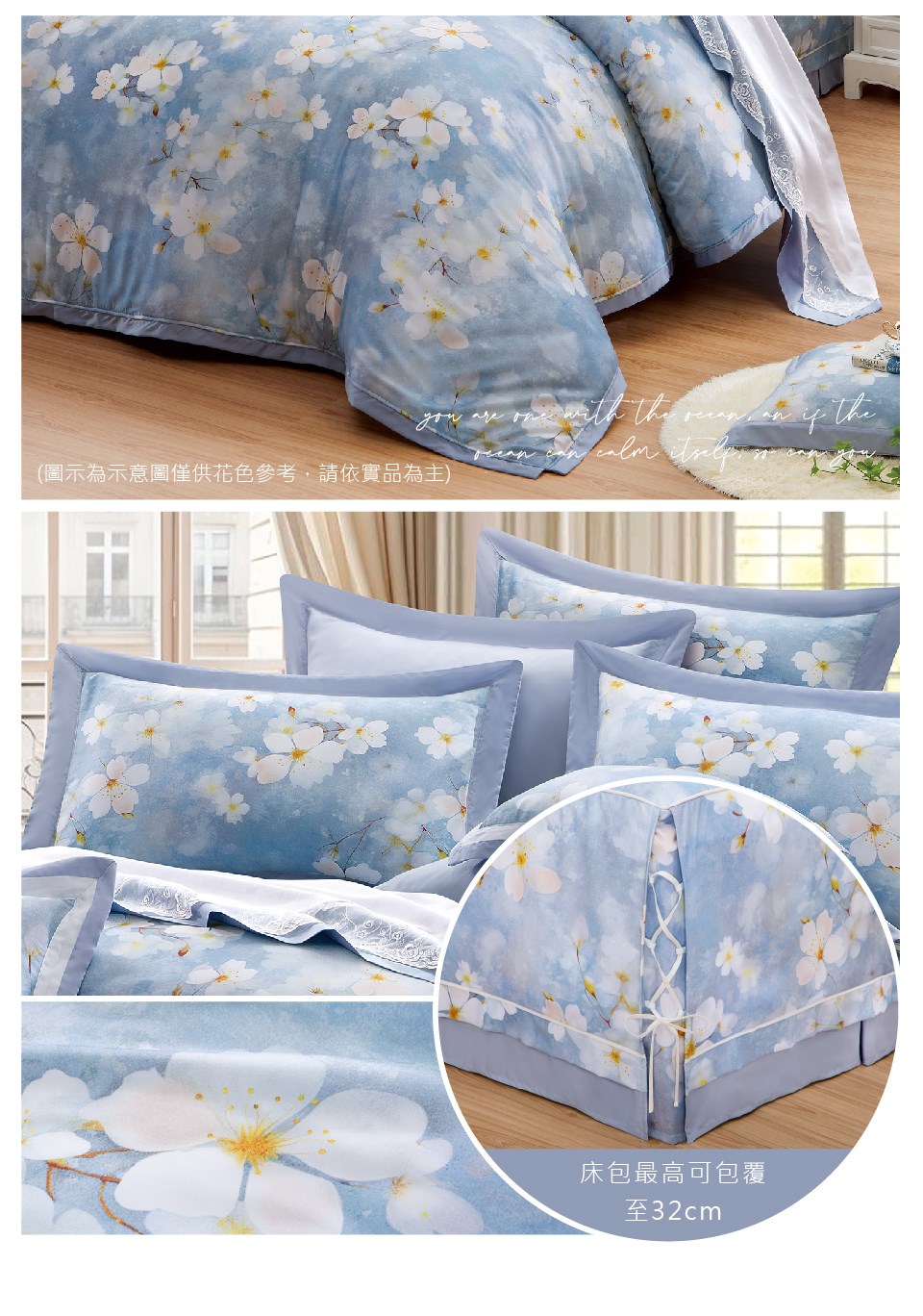 床罩組:鋪棉兩用被*1/鋪棉下裙罩*1/鋪棉厚枕套*2/薄枕套*2/抱枕*1